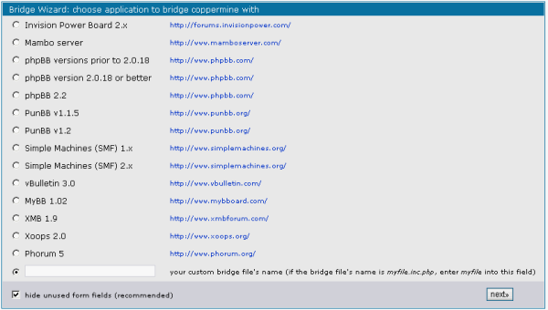 In the first actual step of the wizard "choose application to bridge coppermine with", you have to choose the application you actually want to coppermine with. Note that you must have this application already installed on your webserver, it has to be properly configured and must be up-and-running. Don't use the bridge manager yet if you only plan to integrate coppermine with another application later.