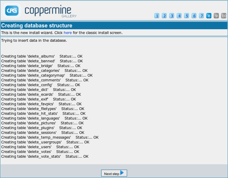 The database structure screen is for information only - there is nothing you can do to interact here. The screen shows the progress of the database operations performed to create the database tables for your gallery. If everything works as expected, you should see a couple of rows with a message like Creating table 'XXX' Status:... OK. If you don't get the status "OK" in each line, something went wrong and needs looking into. This is usually the case if the mysql user account you specified in the step "MySQL user authentication" doesn't have the needed privileges to create the tables. Another reason for failure can be lack of space in the database. In both cases you should contact your webhost for support.