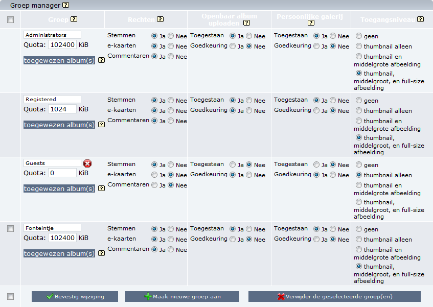Bear in mind that if a user is a member of a group where "Rating", "Comments" or "Public albums upload" is set "YES", s/he will have the right to perform these operations only in albums where they are allowed. ( ie. uploading files will only be possible in albums where "Visitors can upload files" has been set to YES using the album properties screen of particular albums.)